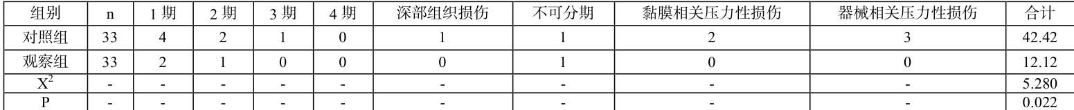 统计两组 ICU 危重患者的压力性损伤发生情况,根据《压力性损伤最新指南》划分压力性损伤程度,指压不变白红斑,皮肤完整为 1 期;部分皮层缺失,暴露真皮层为 2 期;全层皮肤缺失为 3 期;全层皮肤、组织缺失为 4 期,局部或全层皮肤缺失,皮下脂肪暴露,可能伴有肌肉、肌腱、筋膜、韧带或其他深层结构的损伤即为深部组织损伤;全层皮肤与组织缺损,腐肉或焦痂掩盖组织损伤程度,于腐肉、焦痂去除以后,方可判断为3 期或 4 其压力性损伤即为不可分期;器械相关压力性损伤即为身体遭受持续压力时出现的相关压力性损伤;黏膜相关压力性损伤。