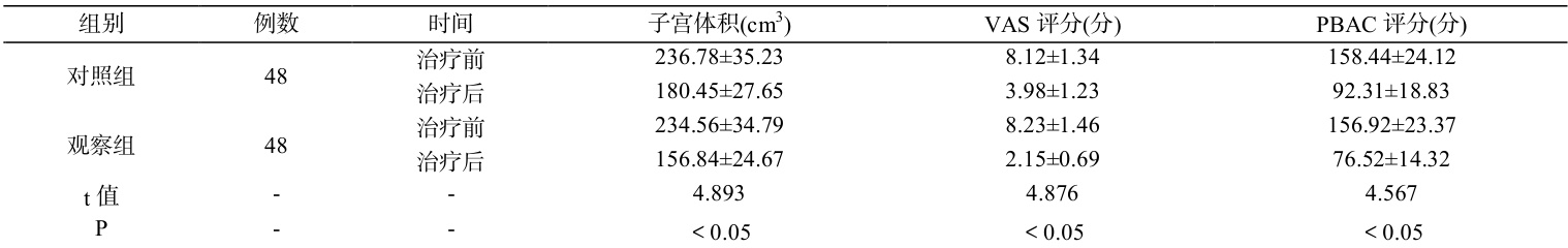 治疗前,两组患者子宫体积、痛经程度、月经量均接近相似( P>0.05 ),治疗后,观察组患者的子宫体积缩小程度、痛经程度缓解情况、月经量减少程度情况均明显优于对照组( P<0.05 )。具体数据分析比较如表 1 所示: