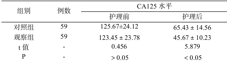 治疗前,两组血清 CA125 水平相似( P>0.05 )。治疗后,两组血清 CA125 水平均显著下降,且观察组下降程度优于对照组( P<0.05 )。详见表