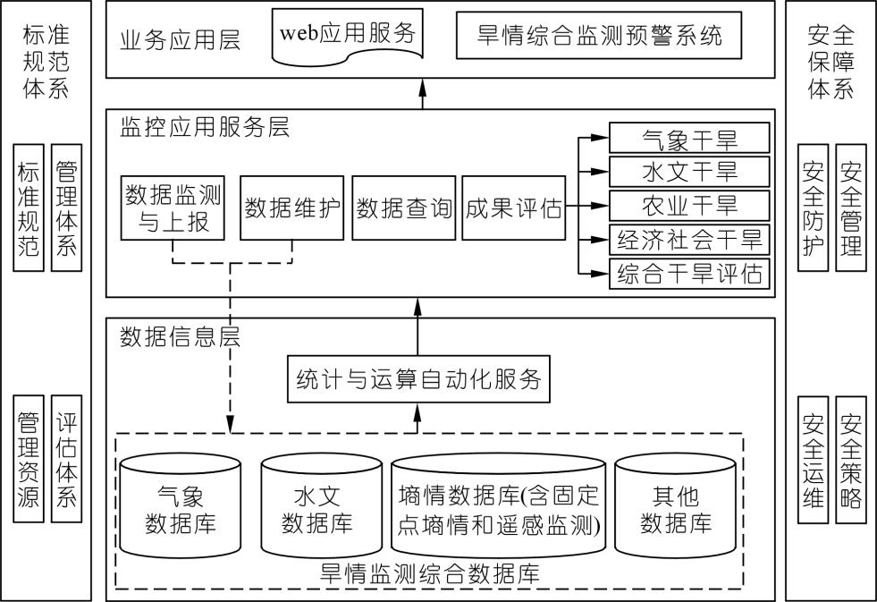 在全球气候变化背景下,干旱发生频率及旱灾损失程度呈显著增强的趋势[9],构建农业墒情监测预警服务管理平台是弥补墒情监测预警服务在信息化方面所存在的不足而采取的实际举措。农业墒情监测系统是一个复杂的多层次系统,旨在实时监测和管理土壤中的水分含量,为农业灌溉和作物管理提供科学依据。其总体架构可以分为数据采集层、数据传输层、数据处理层、应用服务层和安全维护层,每一层都包含多个关键组件和功能。如图1: