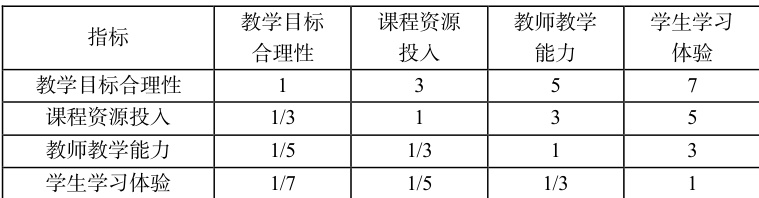 在高职院校的双线混融教学中,教学质量的评估是保障教育效果和优化教学设计的重要手段,评价指标体系构建过程中为了科学、全面地评价教学质量,本文基于 CIPP(背景-投入-过程-产出)评价模型,结合高职教育的特点并构建了四个核心评价维度,即教学目标合理性、课程资源投入、教师教学能力、学生学习体验,对此进一步细化为多个二级指标,教学目标合理性主要考察课程目标是否符合职业教育需求、培养方案及学生学习需求;课程资源投入关注线上课程资源、实验设备、教学软件等教学支持体系的完善程度;教师教学能力衡量教师在双线教学环境下的授课质量、互动能力和课程设计能力;学生学习体验则衡量学生对混融教学的适应程度、参与度和满意度,这四个维度共同构成了高职院校双线混融教学质量评价体系的基本框架,确保评价内容的全面性和针对性。
