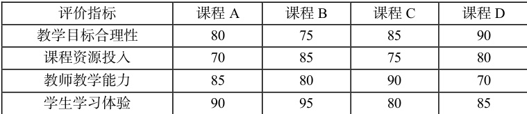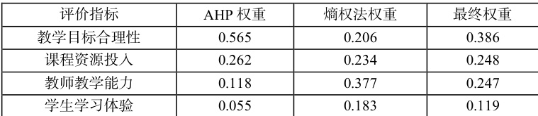 为了避免 AHP 法的主观性偏差,本文引入熵权法进行客观权重计算。熵权法是一种基于数据统计的客观评价方法,通过计算各指标的信息熵,衡量其在数据中的变异程度,从而确定指标的重要性。本文选取某高职院校的四门双线混融课程(课程 A、课程B、课程 C、课程D)的教学评价数据,计算各指标的熵值,并据此确定权重。计算结果如表 2,各指标的熵权依次为:教学目标合理性(0.206)、课程资源投入(0.234)、教师教学能力(0.377)、学生学习体验(0.18