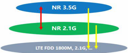 5G 多频智能切换方案要求基站近实时监控每个用户的业务体验,当体验变差时,综合考虑终端、业务需求、网络服务能力,将用户迁移到最优目标频层和小区。如下图中红色箭头所示。