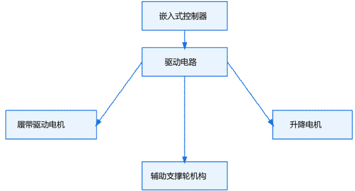 本系统采用模块化设计理念,整体结构主要由嵌入式控制单元、传感器感知模块、执行机构、驱动模块、人机交互模块以及电源管理模块六大部分构成。嵌入式控制单元为系统的核心,负责处理各类传感数据、执行控制算法并协调轮椅的运动逻辑。传感器模块主要用于获取楼梯边缘、台阶高度、轮椅姿态等环境与状态信息,包括超声波传感器、红外测距模块、陀螺仪与加速度计等。执行机构部分主要包括履带驱动机构、支撑轮组件及升降结构,用于实现楼梯攀爬、姿态调整与稳定控制。驱动模块为各执行机构提供电能和功率控制,同时支持正反转与速度调节。人机交互模块允许用户通过按钮、触控屏或语音指令操作轮椅,实时获取系统状态信息。电源管理模块负责整机供电并保障系统在运行过程中的电压、电流稳定,支持应急断电与报警功能。