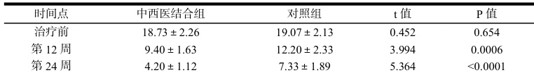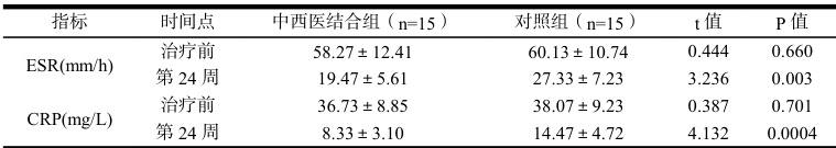 经24 周治疗后,两组患者的炎症指标均有明显改善,但中西医结合组下降幅度更大,且终末点CRP 和ESR 值均显著低于对照组,差异具有统计学意义 P<0.01) 。详见表 2。