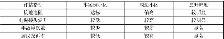 工程完成竣工后,借助开展带负荷试验以及进行第三方检测,各项相关指标均达到标准要求,在运行了一段时期后,和周边那些未曾采用优化策略的小区开展对比,该小区配电方面出现故障的次数很少,平均停电的时长大幅度缩短,关于具体质量指标的对比情况可查看表 1。