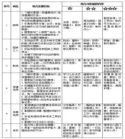 综合上述原则,结合幼儿园空间、材料、师资等实际情况,我们梳理除了 6 个最适宜的职业岗位作为体验的内容,包括厨师、园林工人、保安、教师、保健老师、保育老师等岗位。根据各岗位的职业特点,我们进一步细化和分解了这些职业的核心发展目标,制定了幼儿发展目标,以便于教师在开展体验活动时有目标可循,进而指导后续的体验活动的开展。每个职业岗位可体验的内容上,我们根据小中大不同年龄幼儿的能力制定了 1 星到 3 星的三个层级的梯度体验渐进图,明确了每个年龄段可以在这个岗位中可以做什么、用什么做、怎么做等问题,让职业岗位的体验更加聚焦于幼儿的发展。通过以上系统的梳理,幼儿园职业岗位体验的内容才能真正扎根幼儿生活,激发其主动探索的热情,在生动有趣的模拟实践中获得对岗位的深刻体会,有效践行“生活即教育”的理念。