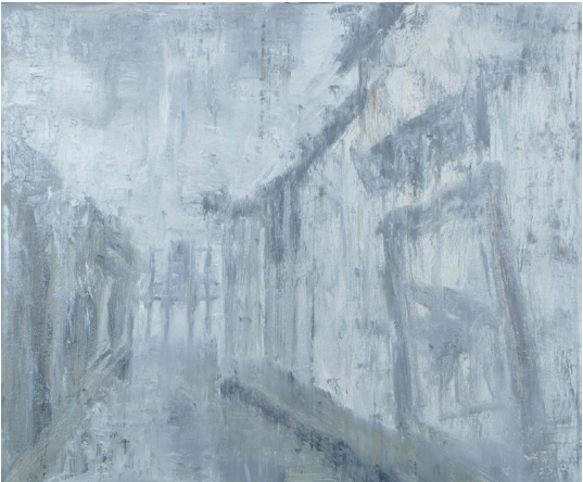 千年土城古镇,是赤水河畔的一枚旧时光。少年时,我常赤脚跑过被雨冲得发亮的青石板,听木门“吱呀”一声把黄昏关进屋里。多年后,古镇的瓦脊、风墙、飞檐,不再清晰,却在记忆里沉淀成一片温柔的灰。于是,我拿起油彩,只想为“记不清”的故乡留一幅“想得起”的画。整幅画几乎没有轮廓。深灰、中灰、浅灰在布面上缓慢呼吸,像一场不肯散去的晨雾。颜料被稀释得极薄,一次次罩染,又一次次刮除;老房子的脊梁在反复遮盖间“隐”出来,又在下一笔里“没”进去。