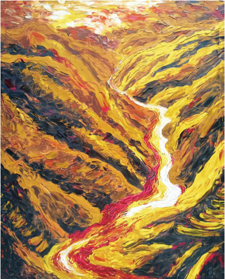 整幅画被深红、大红与金黄三种纯色牢牢统治。 从画底中央劈开的“S”形湾延河道,以刮刀厚堆出纵深。刀锋留下的凌厉棱线,像被炮火犁过的山脊,也像水浪被瞬间冻结的怒吼。河水被一道中线劈成两半,两侧是浑厚的土黄和燃烧的大红;红色逐渐向画面中心聚拢,仿佛仍在扩散,寓意年轻的生命瞬间倾泻,与河水再难分离。两岸峭壁以深红加褐黑竖向拉刮,刀起刀落,留下如斧劈般的断面,既显地势之险,也映心境之峻。天空没有云朵,稍有留白,红黄颜料自天际倾泻而下,与远山在天际处交汇,水天一色,天地同脉,仿佛整幅宇宙只剩这一条血火交织的长河。