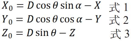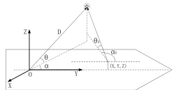 设不稳定舰艇参考系 O-XYZ 的原点在经纬仪所在的位置,经纬仪距标定物的距离为 D;被测设备所在位置在该参考系的坐标为(X,Y,Z),经纬仪测量标定物的舷角为 a ,俯仰角为 θ ,则标定物到被测设备的距离在三个坐标轴上的分量分别为: