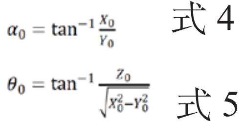 向舰艇总体设计单位索取架设经纬仪的舰艏线标识板坐标和被测设备底座中心坐标关系,结合被测设备俯仰轴距离甲板高度和经纬仪高度,得到被测设备在基准参考坐标系中的坐标(x,y,z),甲板经纬仪测得的标定物距离、舷角、俯仰角,由式 1 至式 5 计算出被测设备测量标定物的舷角真值 α0和俯仰角真值 θ0,(α-α0)即为被测设备的舷角零位误差,(θ-θ0)即为被测设备的俯仰角零位误差。