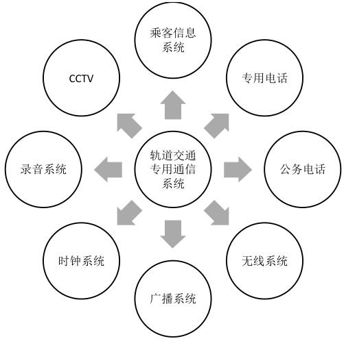 由图 1 可知,轨道交通专用通信系统由公务电话、专用电话、CCTV、乘客信息系统、无线系统、时钟系统、广播系统、录音系统等组成。其中,公务电话主要指轨道交通内需拨号的电话;专用电话主要指轨道交通运行过程中的直通电话(拿起无需拨号);CCTV(closed-circuit television)即闭路电视监控摄像头;乘客信息系统可为候车乘客显示到站时间;广播系统用于车站播放广播;无线系统以对讲机为载体连通轨道交通列车司机、车站;时钟系统可用于地铁车站全部时间的校对;录音系统可监听全部电话、对讲机等通信设备。