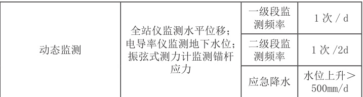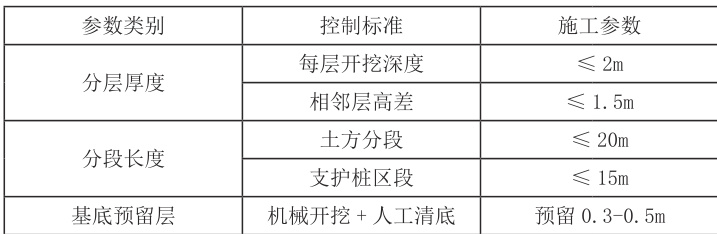 土方开挖是建筑基坑施工中的关键环节,合理有序的土方开挖能确保基坑按照设计要求成型,为后续基础施工创造良好条件。一方面,施工人员应选用合适的土方开挖方法,常见有分层分段开挖、盆式开挖、岛式开挖等,具有不同的适用性 [3]。其中,分层分段开挖法较为常用,即按照一定厚度分层、按照一定长度分段开展土方挖掘作业,能有效控制土体的稳定性,避免一次性开挖深度过大引起边坡失稳;盆式开挖法是 先挖基坑中间部分的土方 ,周围四边预留反压土坡,具备周边土方开挖条件时,再进行周边土坡的开挖 ;而岛式开挖法则是先挖基坑周边的土方 ,在基坑中部形成类似于岛状的土体,最后再开挖基坑中部的土方。本工程中,施工人员遵循“先深后浅、对称均衡”原则采用了分层分段开挖法,把拟施工区域共划分为 6 个区段,每层开挖深度控制在≤2m 的范围内,分段长度则≤20m,保障了边坡的稳定性。另一方面,施工人员应严格控制开挖参数,包括开挖深度、坡度、范围等,并采用水准仪、全站仪、卫星定位系统(GPS)或实时动态差分定位技术(RTK)等多样化测量设备进行监测,以便及时发现并纠正偏差问题。本工程土方开挖过程中,施工人员明确了开挖参数控制标准,采用了信息化监测方式动态监测具体的开挖情况,详见下表2。