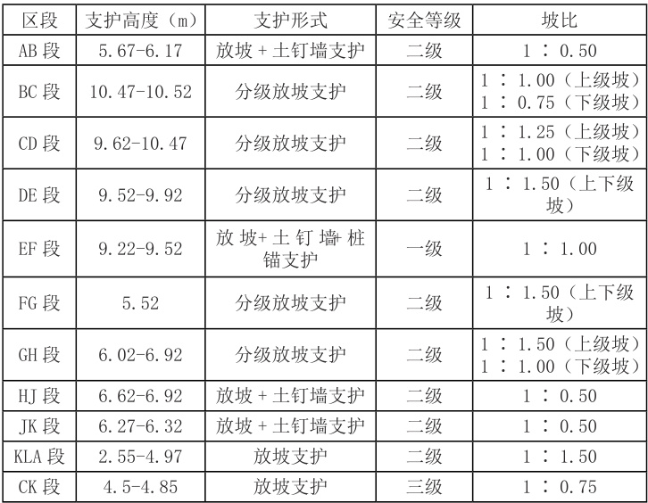 放坡支护是建筑工程中常见且简单的基坑支护方式,其主要基于土体的力学特性,利用一定坡度的土体自身重量和内摩擦力维持边坡稳定,达到抵抗土体侧压力、保证基坑施工安全的目标。在实际应用过程中,确定放坡的坡度大小是首要环节,技术人员应综合考虑土体性质、基坑深度、施工区域环境条件、红线内放坡空间充裕程度等多因素,科学设置不同区段的坡比 [5]。在本工程中,技术人员将基坑边坡具体划分为 11 个区段,明确了支护高度、支护形式、安全等级、坡比等参数,旨在提高基坑支护质量及实施效率,详见下表3。