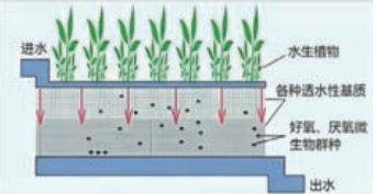 在深度处理与生态强化过程中,采用化学修复技术,二级处理出水后,投加聚合氯化铝、硫酸铁等化学除磷剂,与磷酸根离子发生反应,生成难溶性磷酸盐沉淀,进一步降低总磷含量,保证出水达到级 A 排放标准。还可以通过建设人工湿地(图 3),作为深度处理单元,湿地内种植芦苇、香蒲、菖蒲等耐污植物,利用植物吸收、基质吸附、微生物降解等方式,去除残余的有机物、氮磷、悬浮物。