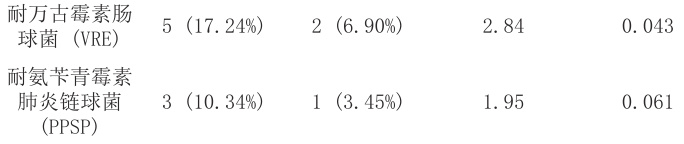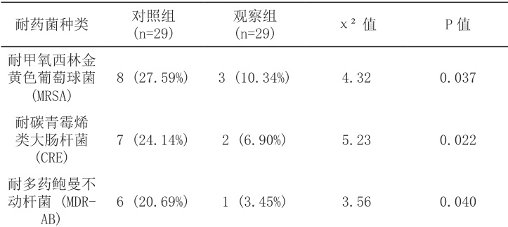 观察组的院内耐药菌感染率显低于对照组(P<0.05)。见表1。表1 :院内耐药菌感染发生率