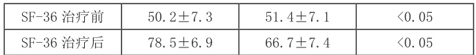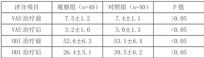 治疗前,观察组和对照组的VAS 评分无显著差异( P>0.05 )。治疗后,观察组的 VAS 评分显著低于对照组( P<0.05 )。治疗后,观察组的 ODI 评分显著低于对照组,说明观察组患者的腰椎功能恢复较好,且恢复时间更短。观察组的SF-36 健康量表评分显著高于对照组,表明观察组患者的整体生活质量得到了显著改善。具体数据如下:
