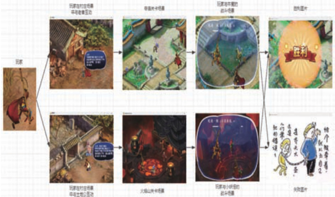 游戏以西游记故事为背景 , 设有村庄场景 , 寺庙场景 , 火焰山场景 , 初始时玩家可在村庄场景中选择与老者互动 , 挑战寺庙关卡 , 或选择与土地公互动 , 挑战火焰山关卡 , 若玩家寺庙关卡和火焰山关卡都通关成功 , 则玩家能够正常退出游戏 , 若玩家未成功通过所有关卡则会返回村庄场景 ,玩家可在村庄场景中选择继续与 NPC 互动 , 尝试挑战关卡 , 或强制退出游戏