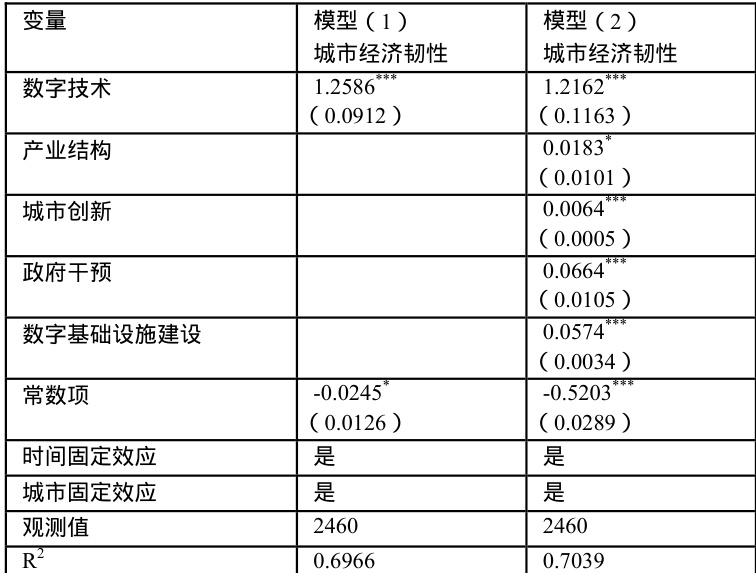 本文以我国 246 个地级市 2014 年至 2023 年的数据为研究对象,分析数字技术对城市经济韧性的影响和作用机理。为验证数字技术对城市经济韧性的影响以及作用机理,本文构建基准回归模型分析数字技术对城市经济韧性的直接影响。