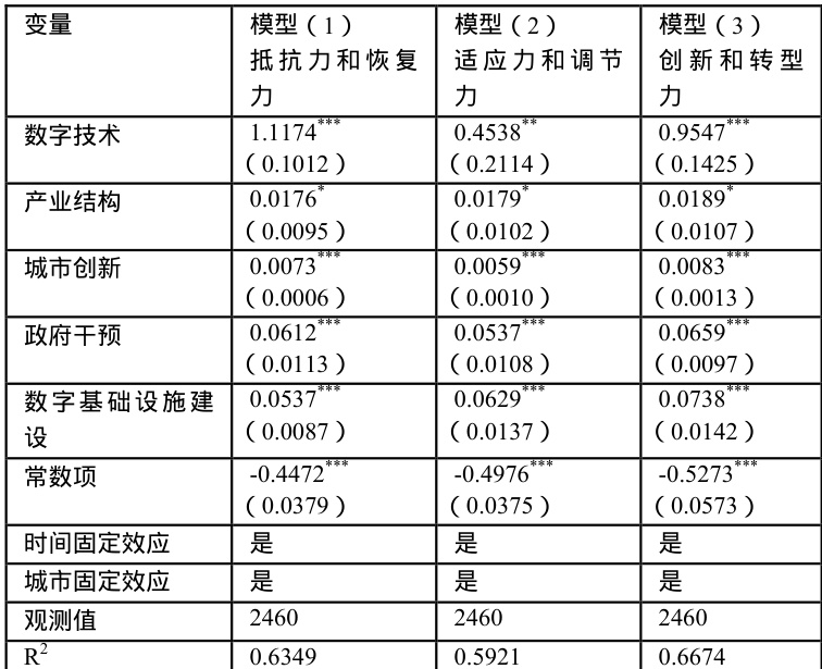 首先建立如下的固定效应模型,控制时间和城市的差异,检验数字技术对城市经济韧性的影响。