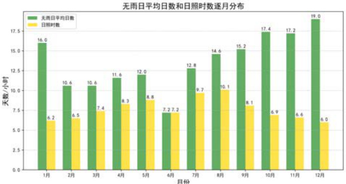 根据相关测站多年气象观测可知,石林日晒面主产区(以下称为该地区)年均无雨日164.2 天,占比 45‰ 。按照季节分布,春季无雨日为10.6-12天,夏季除6 月受梅雨影响外,其余时间在12.8-15.2 天之间,秋季受高压控制,天气总体晴朗干燥,无雨日数在 17.2-17.4 天,冬季 16-19 天。下文中对该地区气象要素的分析,均为无雨日中的观测要素统计平均值。