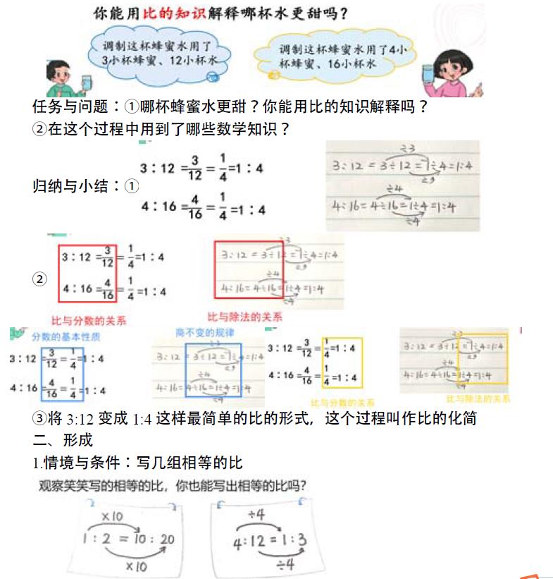 2.经历从探究“ 哪杯蜂蜜水更甜” 的具体情境中产生化简比的必要性,进一步体会比的意义,初步感知比的基本性质。在比较和判断中,发展学生的推理意识。在观察、猜想、验证、得出结论的过程中进一步发展学生的推理意识。