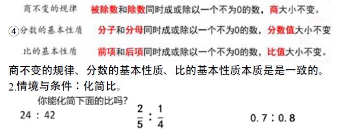 3.能运用商不变的规律、分数的基本性质、比的基本性质化简比,并能解决相应的简单实际问题,在解决问题的过程中,发展学生的应用意识。
