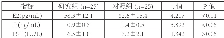 研究组 E2、P 显著低于对照组(P<0.05),FSH 无差异(P>0.05)