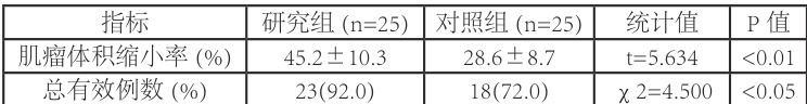 2.3 肌瘤体积研 究 组 缩 小 45.2% ( 对 照 组 28.6% , P<0.01⟩ ), 总 有 效 率 92.0% ( 对 照 组 72.0% ,