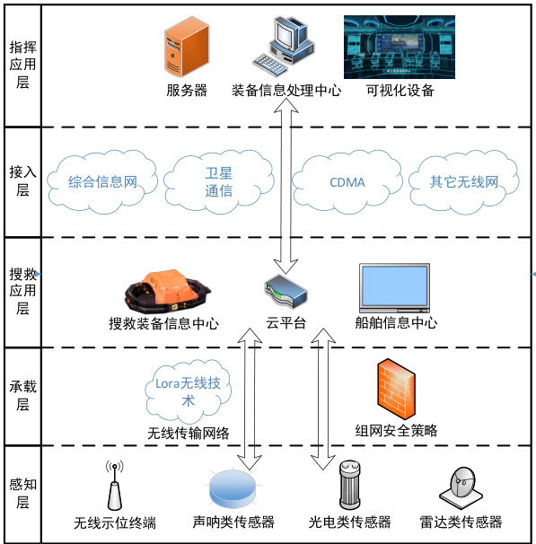 为了提高海上搜救效率,应研究探索如何提升两种搜救装备的协同作业能力,当前物联网技术得到了快速发展和广泛应用,其中物联网组网技术在海上搜救装备中的应用涵盖了通信、监测、数据传输等多个领域,能够实现搜救设备间高效、稳定的信息交互和无人搜救装备远程控制,依托智能决策算法能够提升搜救任务的自主性与适应性。海上搜救装备物联网技术架构包括感知层、承载层、搜救应用层、接入层和指挥应用层等5 个部分,如图2 所示。
