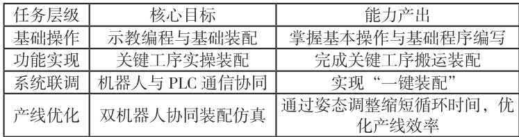 以工业机器人技术应用大赛“谐波减速器装配”赛题为原型,将实训内容转化为四级阶梯任务,如表 1 所示,实现“从单一技能到综合能力”的递进培养。