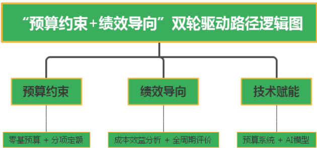 “预算约束 + 绩效导向”是基层机关推进运行成本精细化管控的关键措施。基层机关以预算约束为抓手,可通过零基预算改革的方式,对传统“基数 + 增长”模式进行有效打破,并利用“历史数据 + 绩效评估”的方式,对预算进行动态调整,从而实现对高效项目和民生项目有效保障。基层机关以绩效导向为依托,则可以以结果为导向,对过程进行优化,即利用成本效益分析法,对投入产出比进行量化,进而推进资源向高效益领域进行倾斜。如,可以建立完善的预算编制机制,即以历史数据为媒介,围绕职能部门的实际发展需要,对预算额度进行重新核定,以实现对民生、公共服务等高效益领域的优先保障。同时,还应制定科学有效的分项定额标准,并协同利用“问题导向 + 部门协同”的方式,对预算编制进行科学调整,以充分保障预算编制的科学性、合理性和可操作性。此外,要深化绩效评价体系,即强化对成本效益分析法的应用,以能从成本结构和历史水平出发,对公共服务项目进行横向对比,促使企业对流程进行有效优化,最终达到节约成本的目的。同时,还要强化结果应用,即将资产利用率和成本节约率等指标有机融入部门考核中,以绩效问责的方式,切实减少非刚性支出。如图 2 为基层机关“预算约束 + 绩效导向”的双轮驱动路径逻辑图。