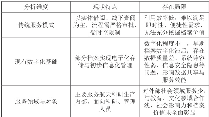 当前航天档案服务利用在新旧模式交替中面临诸多挑战,传统服务模式的局限性、数字化进程中的难题,以及服务领域与对象的单一性,都制约着航天档案价值的充分发挥。以下从三个维度进行简要梳理: