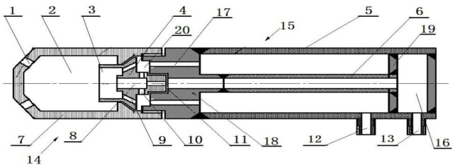 枪身头部设有分别与内管和外管相连通的连接器,气泡室尾部的油气分配器与枪身头部的连接器连接,喷油口与内管和连接器形成燃油通路。涡旋室尾部侧壁沿周向均布径向进气口,涡旋室中部沿周向均布送气孔,涡旋室尾部侧壁环绕空气分离腔。连接器沿周向均布有连通外管的环状内腔和空气分离腔的轴向连通孔,送气孔连通聚能室内腔和空气分离腔,径向进气口连通涡旋室与空气分离腔[4-5]。