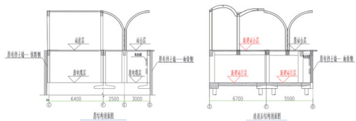 根据上述思路,现有的二层站房全部拆除新建,站台板板底碳纤维加固。现站台板下的梁柱拆除新建,是本次梁柱结构体系改造的难点和重点。