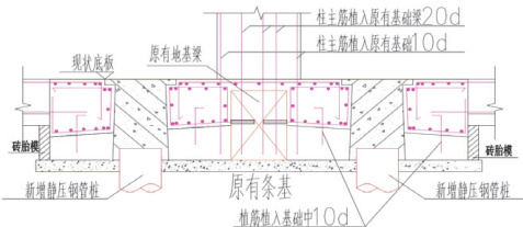 新建底板预先埋入静压钢管桩反力锚杆,预留压桩孔。待新建底板及承台基础养护达到设计强度后,使用小型设备对原钢筋混凝土基础进行开孔至基础底。压桩架与反力锚杆使用螺帽连接,安装千斤顶,利用反力分节压入薄壁空心钢管。单节钢管长度为 2m,钢管间连接采用套管焊接工艺。静压钢管桩压桩速率不大于 0.2m/min ,一次压桩到位,对称跳桩施工。压桩至设计深度后,下部采用细石混凝土进行灌桩,上部 50cm 采用钢筋与新建底板焊接,采用同强度的膨胀混凝土进行封桩。