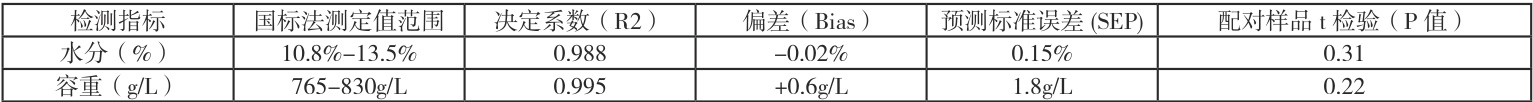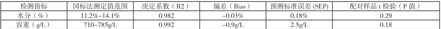 对于玉米样品,该仪器同样表现出很高的准确性。水分和容重的决定系数(R²)均超过0.98,与国标法高度相关。其预测标准误差(SEP)虽因玉米籽粒不规则而略高于小麦,但精度完全满足快速检测要求。极小的偏差(Bias)和统计学检验( P>0.05 )共同证实了其检测结果准确可靠。