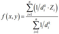 其中 f(x,y) 为坐标点 (x,y) 的预测值; Zi 为 (x,y) 处的测量值;n 为参与插值点的预测点周围样点的数量;di 为预测点距各已知样点的距离;k 为指定幂,即权重,一般取值范围为 ~2 。