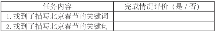 (2)任务二:教师以课文第三自然段为例引导学生进行关键词寻找,完成后迁移至整篇课文寻找描述北京春节的关键词句,目的是让学生能够从课文中找到描写北京春节的关键词句,教学评价内容见表2。