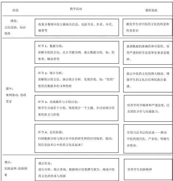 结合我校的特色和专业的发展定位,以中医药文化的传承与创新为行动指南,我们精心选取“中医古籍数据库”作为教学案例,进行课程思政教学的优化。课前先让同学们收集中医古籍的相关信息,如中医古籍的书名、作者、年代、内容摘要、类别等信息,以便更好的理解教学内容并参与课堂讨论;课中围绕“数据的分组与统计” 知识点进行课程思政的引导与探讨,通过案例分析、小组讨论的方式,让学生在掌握专业知识的同时,深刻体会中医药文化的博大精深,培养学生的文化自信和传承意识、团队合作精神与沟通能力;课后,布置相关作业,要求学生撰写根据查询结果撰写总结报告,进一步巩固所学知识,并鼓励学生在实践中探索中医药文化的传承与创新路径。具体如图 1 所示:
