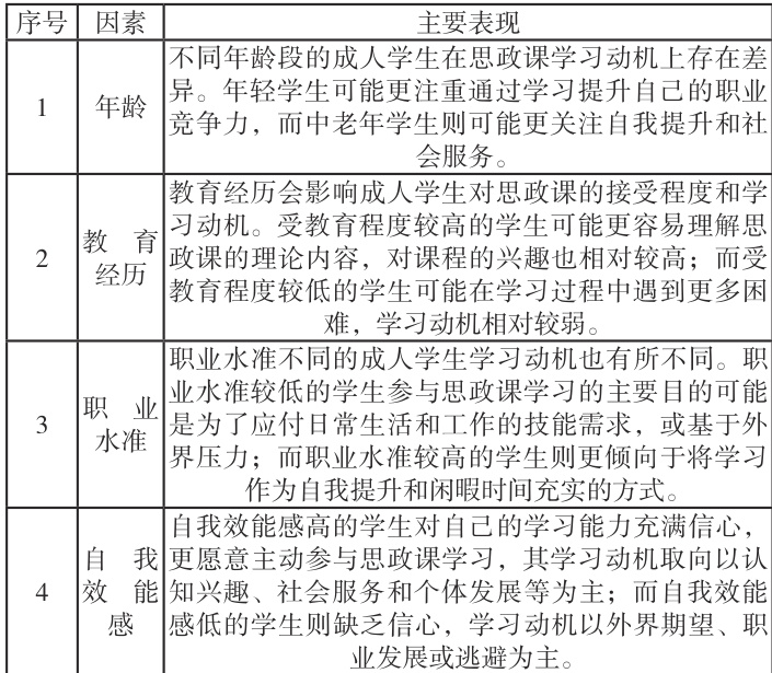 年轻成人学生处于事业打拼阶段,学习思政课多是为提升学历、增强职场竞争力,将课程视为职业发展的助力,学习动机功利性较强;中老年学生历经社会磨砺,更注重自我完善与精神追求,学习思政课旨在丰富内心世界、实现自我价值,动机更具内在驱动性。受教育程度高的学生,知识体系较完善,对思政课理论有更强的理解和接受能力,能从课程中获取更多精神滋养,学习动机以认知兴趣和自我提升为主;而受教育程度低的学生,面对抽象理论易产生畏难情绪,学习动力不足,动机多源于外部压力,如获得文凭、满足家人期望等。此外,自我效能感高的学生,相信自己能学好思政课,积极参与课堂讨论和实践,学习动机稳定且持久;自我效能感低的学生则缺乏信心,学习积极性不高,动机易受挫折影响而减弱。内在影响因素如表1 所示。