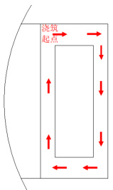 混凝土在浇筑过程中实现分层浇筑,并对厚度进行严格把控,提高混凝土浇筑的安全性。首先,在浇筑过程中,需根据浇筑的厚度进行分层调整,需配备 1 台泵车进行连续浇筑,防止混凝土底层发生凝固,对后续浇筑质量造成影响。为了提高大面积混凝土浇筑的密实度,可在闸室内设置宽度为 50 米的马道板,一旦浇筑高度为马道板的一半,需利用人工稳固泵管,振捣混凝土。在浇筑过程中,需选择 50 型 9m 长振捣棒,确保混凝土振捣的密实度,同时需要配备多个工人对浇筑的模板进行观察,一旦发现模板、支架发生变形,需立即停止浇筑工作,直到加固完成后才能继续工作。泥凝浇筑图如下所示: