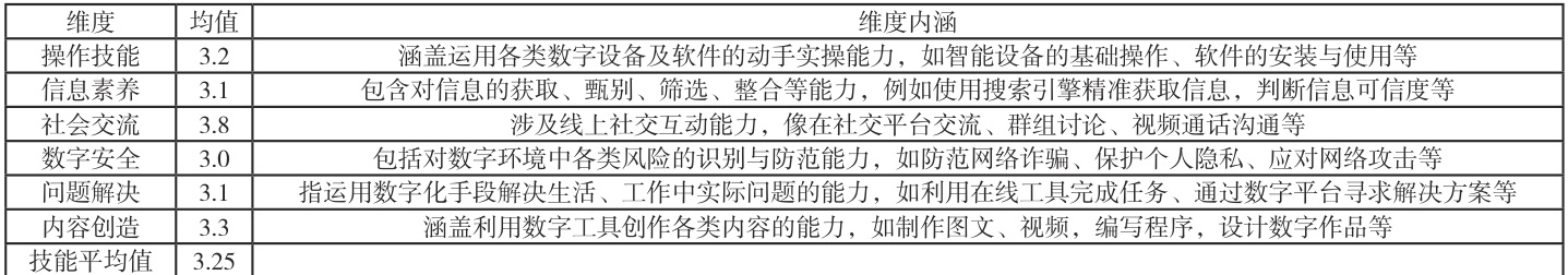 操作技能的均值得分为 3.2 分,处于各维度中的中等水平。该维度呈现出“基础操作强,进阶管理弱”的特征。农民对数字设备高频基础应用较熟练,但软件更新、系统操作、删除等进阶管理能力薄弱,一方面,由于数字设备与软件更新快、操作方式多变,农民难适应,且不同设备和软件操作逻辑有差异、部分操作复杂,增加农民学习难度,因此,进阶操作易滞后。另一方面,现有针对农民数字技能的培训多集中基础操作,对进阶“细节技能”覆盖不足,未弥补农民设备系统管理短板,加剧操作技能不平衡,使其处于中等水平。同时,本次调研群体中中老年农民占比大,这一群体的特征为技术接受度低、有“技术畏难”心理,学习和适应能力不足,又缺乏针对性指导培训。