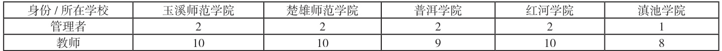 问卷 1 受访者有 12 人,其中管理者身份 2 人,教师 10 人;楚雄师范学院受访者有 12 人,其中管理者身份 2 人,教师 10 人;普洱学院受访者有 11 人,其中管理者身份 2 人,教师