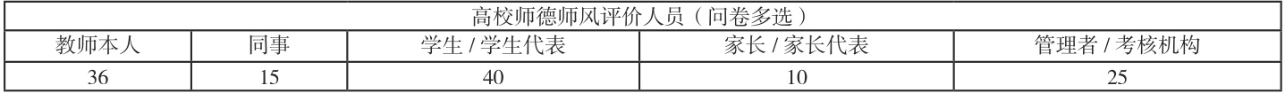 3. 师德师风评价存在的问题。2021 年,李刚基于四川省的实证调查发现,高校师德师风建设评价体系存在下列问题:评价体系公平但仍存在结果不实现象、评价导向清晰但效能不佳、评价体系满意度较高但标准单一。2023 年,王俊等人研究发现,高校师德师风评价问题主要表现在以下几个方面:评价理念的时代性与引领性不足、评价指标过于笼统、定性、定量评价未能有效统一、评价主体构成科学性不足。