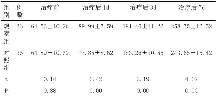 察组治疗后各时间点的氧合指数皆高于对照组, P<0.05 。见下表2。