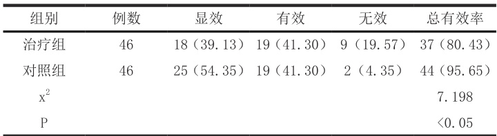 观察组治疗总有效率显著高于对照组( P<0.05 )。见表1。
