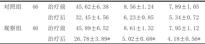 治疗前,两组子宫内膜厚度相当( P>0.05 );治疗后,观察组子宫内膜厚度显著低于对照组( P<0.05 )。见表