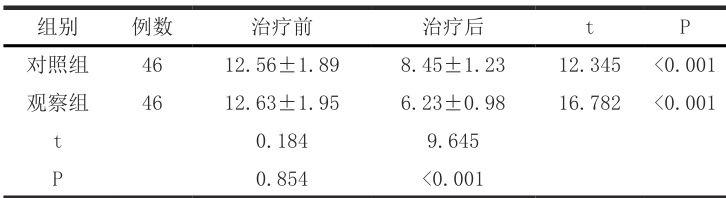选取 2024 年 1 月—2025 年 1 月本院收治的 92 例 AH 患者。采用随机数字表法分为对照组和观察组,每组46 例。对照组年龄23\~48(35.42±5.13)岁;病程1\~5( 3.02±0.85 )年。观察组年龄22\~47( 35.08±5.36 )岁;病程1\~6( 3.14±0.92 )年。两组一般资料比较,差异无统计学意义( P>0.05 ),具有可比性。