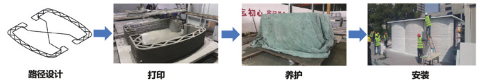 3D 打印混凝土技术是将 3D 打印技术与混凝土材料技术结合而产生的新的智能制造技术。主要流程如图 1 所示,其主要原理是将混凝土构件进行3D 建模和分割产生三维信息,打印过程中,混凝土通过喷嘴逐层挤出,按照数字化设计的路径进行堆积。